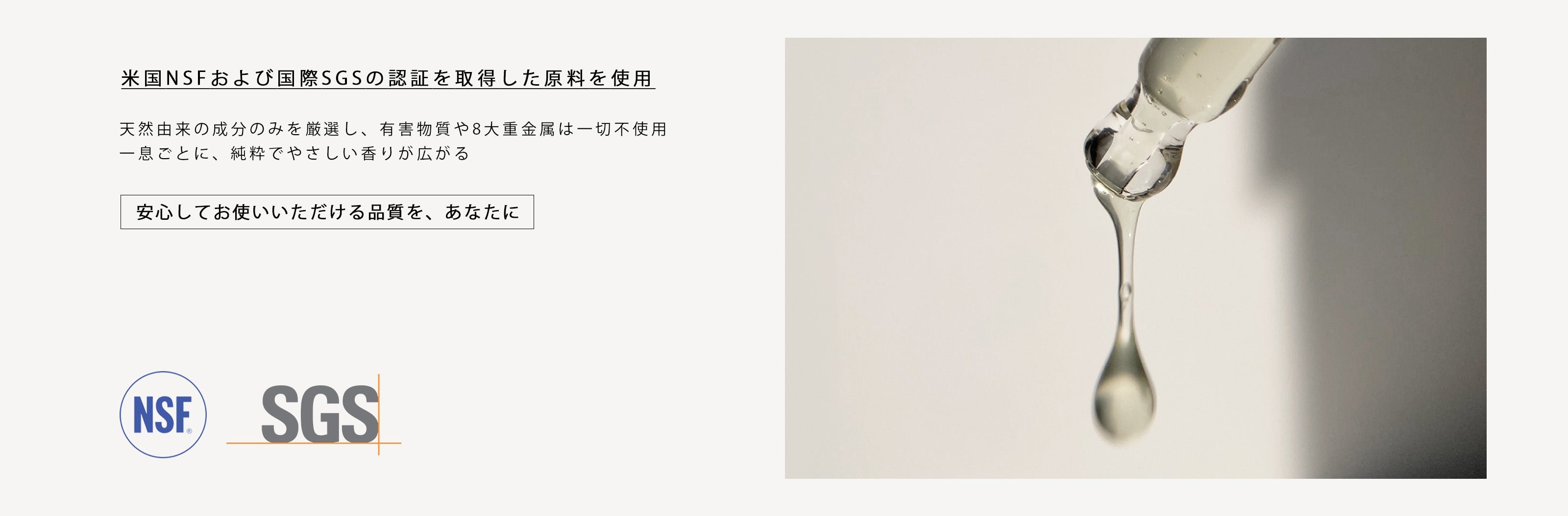 NSF・SGSのダブル認証取得。美しく澄んだ香りを、安心してお楽しみいただけます